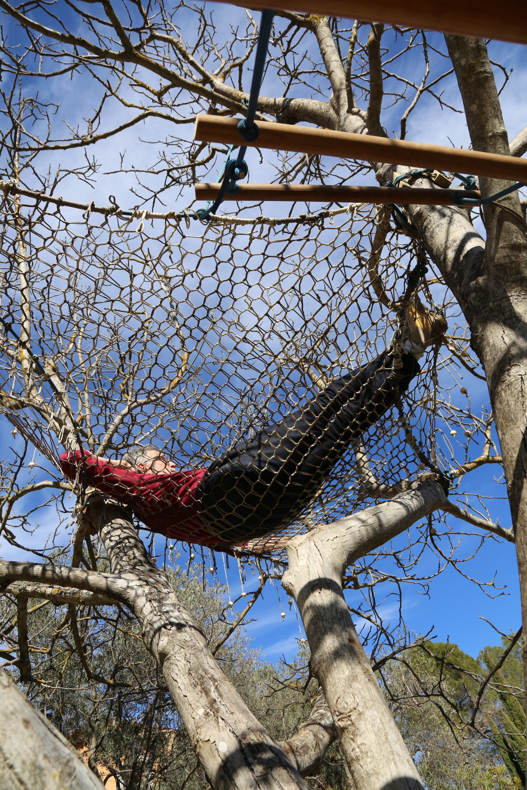 Chaque filet est unique et s’adapte à votre Arbre. J’utilise des cales et des chevilles en bois de récup‘ pour minimiser l’impact de l’installation pour l’arbre.